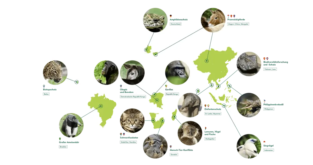 Der Kölner Zoo steuert nicht nur eigene Natur- und Artenschutzprojekte, sondern fördert auch die Arbeit ausgewählter Partnerorganisationen. So werden inzwischen über 20 kleinere und größere Projekte in Afrika, Asien, Südamerika und Europa auf vielfältige Weise unterstützt.